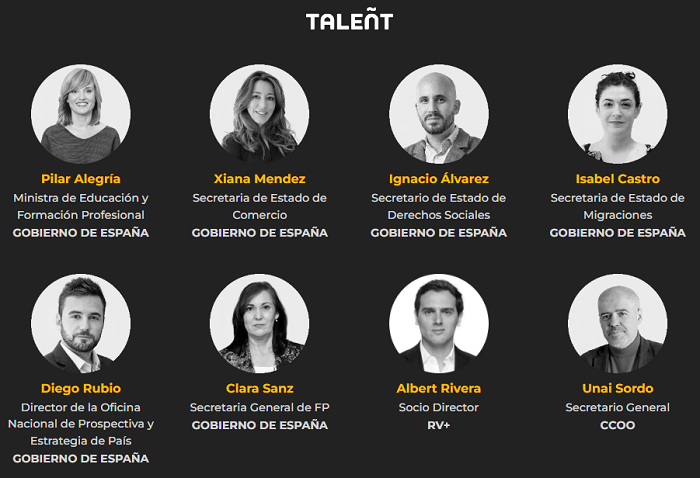 - Figuras políticas: Pilar Alegría, ministra de Educación y Formación Profesional; Albert Rivera expresidente de Ciudadanos y socio director de RV+; Xiana Mendez, secretaria de Estado de Comercio; Ignacio Álvarez, secretario de Estado de Derechos Sociales; Isabel Castro, secretaria de Estado de Migraciones; Diego Rubio, director de la Oficina Nacional de Prospectiva y Estrategia de País y Clara Sanz, secretaria general de Formación Profesional.