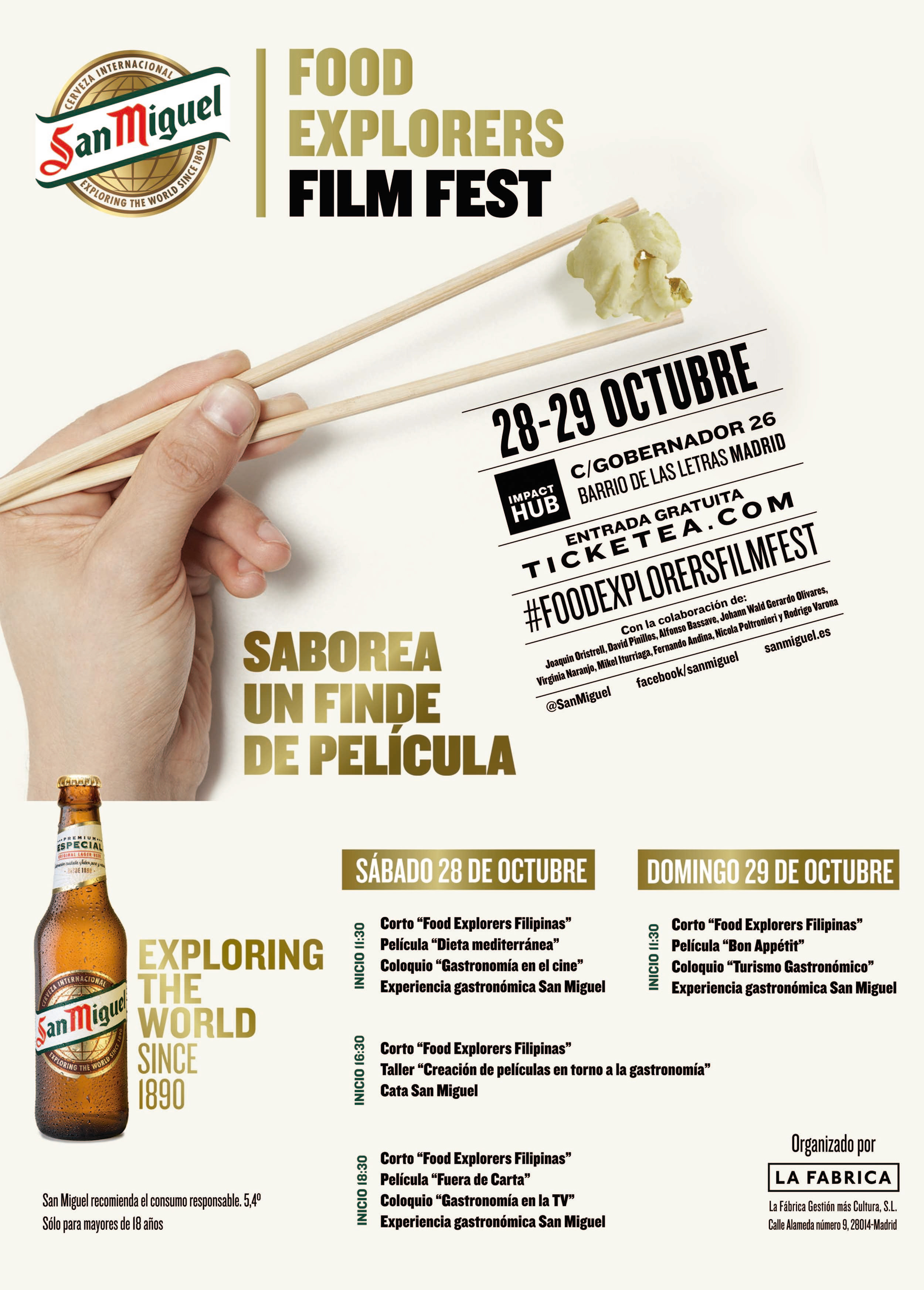 Una nueva propuesta para comerse el mundo sin salir de la ciudad. Food Explorers Film Fest desembarca en Madrid el 28 y 29 de octubre para disfrutar de forma gratuita del mejor cine y gastronomía del mundo.´Cine para exploradores, talleres, coloquios y degustaciones gastronómicas para descubrir nuevos destinos y sabores. Una experiencia inolvidable que compartir con cerveza San Miguel.