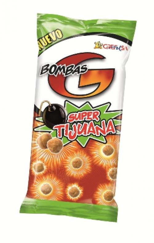 Las auténticas Bombas G SuperTijuana llegan ahora solas y en formato de ración individual de 35 gr. Bombas súper crujientes, con explosivo sabor Tijuana, dirigidas a los fieles seguidores del sabor Tijuana que reclamaban las bombas del Supertijuana Mix en un solo producto.