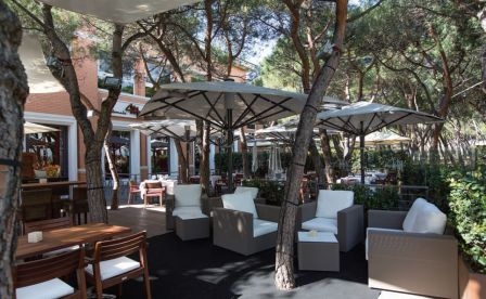 La terraza cuenta también con un espacio propio como prolongación de la sala del restaurante. Suelo de teca, pinos, mesas de madera natural y lonas blancas y un servicio atento y muy profesional, hacen de esta zona de la terraza el mejor lugar en el que disfrutar no sólo del agradable y exclusivo entorno que ofrece la plaza de la Fuente de la Moraleja, sino también de una cocina ítalo-mediterránea excelente y al aire libre.