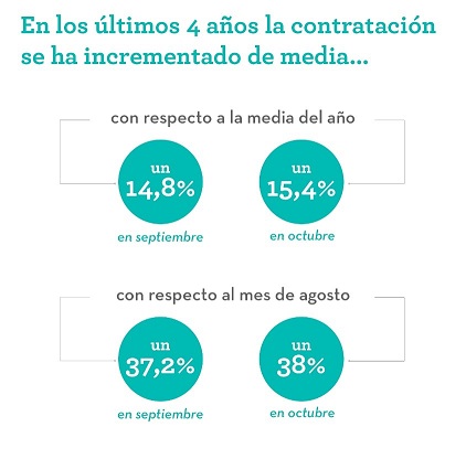 - Si se comparan los empleos generados en estos meses con respecto a los creados en agosto, las cifras son aún más elevadas. En los últimos cuatro años, se han creado, de media, un 37,2% más de contratos en septiembre y un 38% más en octubre que los realizados durante el mes de agosto.