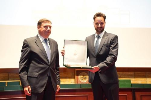 El ministro de Agricultura, Pesca y Alimentación, Luis Planas, ha hecho entrega de la placa de oro de la Orden Civil del Mérito Agrario, Pesquero y Alimentario a la Facultad de Veterinaria de Córdoba, en el marco de la celebración de su 175 aniversario, que ha tenido lugar, hoy, en el Salón de Actos Juan XXIII del Campus Universitario Rabanales. El decano de la facultad, Manuel Hidalgo, ha recogido la distinción, la máxima que concede el Ministerio de Agricultura, Pesca y Alimentación a instituciones.