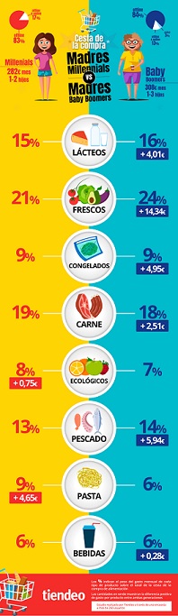 El estudio de Tiendeo.com recoge que las madres baby boomers gastan un 13% más al mes en la lista de la compra que las madres millennials. Frente a los 272€ de media que éstas últimas invierten al mes, el gasto de las baby boomers alcanza los 311€.