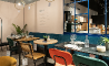 La composición se contrasta con referencias más industriales que incluyen madera y metal, así como vegetación para añadir un toque más natural y acogedor. El diseño tipo años 20 también se refleja en los colores: verde agua y verde oscuro para el vestíbulo, y azul zafiro en contraste con rosa pastel y ocre cálidos para el restaurante.