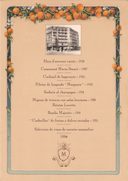 El Menú Especial Centenario ofrece a los visitantes comenzar con unos exquisitos Hors d’oeuvres variés (1918), seguido de un Consommé Maria Stuart (1927) y de un suculento Cocktail de bogavante (1935). La propuesta continúa con Filetes de lenguado ‘Marguery’ (1918) y Sorbete al champagne (1918), para posteriormente degustar Mignon de ternera son salsa bearnesa (1928). El toque dulce lo ponen tanto la Bomba Majestic (1918) como los ‘Cobeilles’ de fruta y dulces variados (1935). Todo ello, maridado con una excelente selección de vinos del sommelier de Majestic Hotel & Spa Barcelona, por un precio que hace honor a la importante efeméride que vive durante 2018 el establecimiento: 100 euros.
