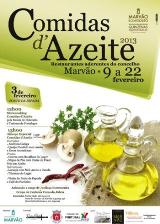 Del 9 al 22 de Febrero, el concejo de Marvão y su capital medieval celebran las ‘Comidas de Aceite 2013’, una quincena gastronómica en la que los protagonistas serán las creaciones culinarias a base de aceite de oliva virgen autóctono de la región del Alentejo. Además, y como anticipo a estos 15 días de festín gastronómico, la localidad de Porto da Espada ha preparado un showcooking seguido de un menú especial con platos realizados con aceite como ingrediente principal.