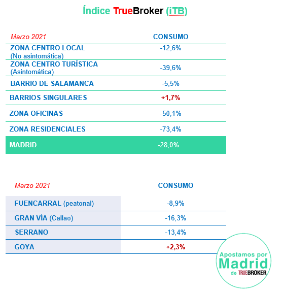 “En general, - señala Pablo Beltran CEO de TrueBroker,- sigue habiendo dos grupos de zonas y calles muy diferenciadas. El Grupo que, desde el inicio, muestra una tendencia continuada a absorber más rápido una posible recuperación, como son los Barrios Singulares, El Barrio de Salamanca y la Zona Centro Local, con unos sorprendentes resultados en marzo que no esperábamos (+1,7%, -5,5% y -12,6%), datos buenos y prometedores, aunque siempre desde la llamada a la templanza, porque en el mes de abril esperamos que los factores que sumaron desaparezcan y podríamos encontrarnos con una contracción. No obstante, aunque suba o baje el consumo, vemos una clara tendencia a la recuperación. Por otro lado, están las otras zonas, que marcan una clara tendencia, aún hoy, 9 meses después del fin del estado de alarma, a recuperarse con mucha dificultad el consumo, como son las Zonas Residenciales (-73,4%). Las Zonas de Oficinas (-50,6%) están ahí en medio, tendiendo a la recuperación, pero aún le falta ritmo y continuidad para permanecer más de un mes por debajo de la barrera del -50%, como hiciera el mes pasado, que nos sorprendió con un -46,6%, aunque ahora con un -50,1% parecen estancadas, sin decantarse por uno u otro extremo. “
