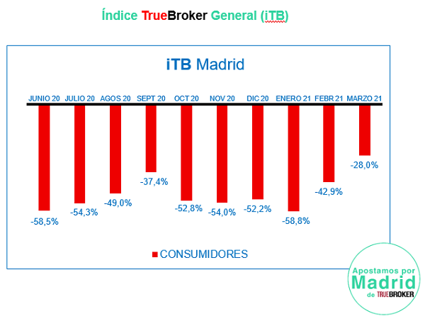 El mes de marzo ha sido bueno en consumo para la capital de España, aunque claramente atípico y anómalo, según el estudio iTB de TrueBroker, una de las principales empresas madrileñas inmobiliarias especialistas en Retail. Durante marzo, acontecieron dos fenómenos atípicos. La primera quincena, marcada por el buen tiempo, provocó la salida de sus ciudadanos a las zonas de Madrid más destacadas comercialmente: las tradicionales Prime del Barrio Salamanca, la Zona Centro Local y las NUEVAS emergentes dominantes en esta nueva era, los Barrios Singulares. En la segunda quincena del mes se sumó al buen tiempo el adelanto de turistas nacionales y extranjeros en sus vacaciones de Semana Santa para esquivar el cierre de fronteras.