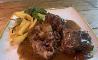 Rabo estofado al vino tinto acompañado de guarnición de patatas crujientes