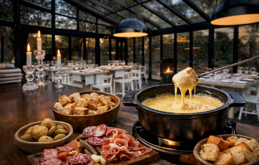 La experiencia se vive especialmente en la terraza de invierno de Cabaña Marconi, un espacio diseñado para disfrutar en los días más fríos gracias a una icónica chimenea de cristal que domina el comedor. Allí, rodeados de naturaleza, la fondue se convierte en el centro de la escena: humeante, reconfortante y profundamente evocadora.