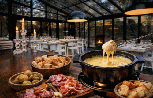 La fondue se elabora lentamente, respetando el equilibrio perfecto entre quesos seleccionados, vino blanco y un sutil toque aromático que realza su profundidad sin opacar su carácter. El queso se funde a fuego suave hasta alcanzar una textura sedosa y envolvente, pensada para compartirse en el centro de la mesa, donde cada comensal participa del ritual, sumergiendo el pan y acompañando el gesto con conversación y pausa.