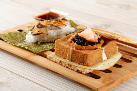 2. Sobre una rebanada de pan de semillas y frutos secos ponemos una loncha de queso Edam y disponemos cortada en cuartos la hamburguesa de tofu