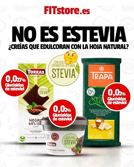 En el caso de la marca Torras, por ejemplo, su modelo de chocolate negro anunciado con estevia tan solo contiene un 0,027% de glucósidos de esteviol, completando su sabor con una mezcla de glucósidos obtenidos mediante procesos químicos. Además las marcas suelen acompañar con tonalidades verdes y hojas en sus envases que pueden hacer confundir aún más si cabe al consumidor.