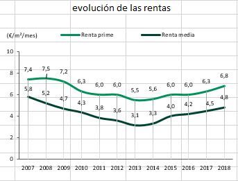 Por su parte, la renta media de los tres arcos logísticos (local, regional y nacional) se ha incrementado un 6,7% respecto a 2017. En el cuarto trimestre de 2018 se situó en 4,8 €/m2. La renta prime ha aumentado también, en este caso un 7,9% hasta alcanzar los 6.06 €/m2.