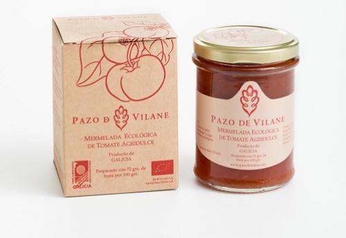 La mermelada de tomate se elabora únicamente con tomate entero procedente de las fincas de Pazo de Vilane, cultivado en un sistema de producción ecológico. Su recolección en el punto justo de maduración permite ofrecer esta mermelada con el 72% de fruta, lo cual la hace adecuada también para acompañar como salsa en platos salados.