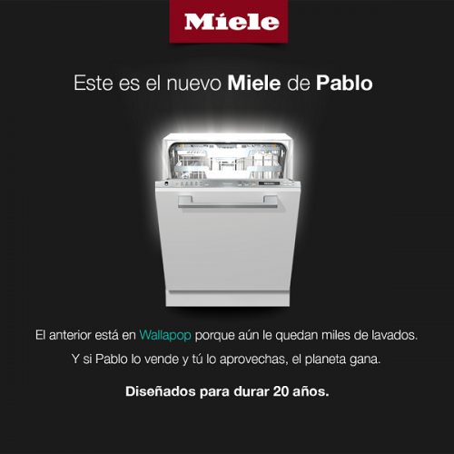 “Este es el nuevo Miele de Pablo. El anterior está en Wallapop porque aún le quedan miles de lavados. Y si Pablo lo vende y tú lo aprovechas, el planeta gana”. A través de esta campaña digital, Miele contesta a la plataforma de compraventa mostrando la importancia de hacer un consumo más consciente y responsable con el entorno.