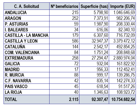 Según los datos enviados por las comunidades autónomas a la base de datos de gestión de derechos de pago básico del FEGA, a fecha de cálculo de asignación de derechos de la reserva nacional, la distribución de la asignación por comunidades autónomas es la siguiente: