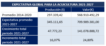 En conjunto, se espera que la producción (t/año) de acuicultura en España para el periodo 2021-2027 se incremente un 16,07 % respecto al periodo 2014-2020; mientras que se espera que el valor de la producción (€/año) aumente un 24,80 % en ese mismo periodo: