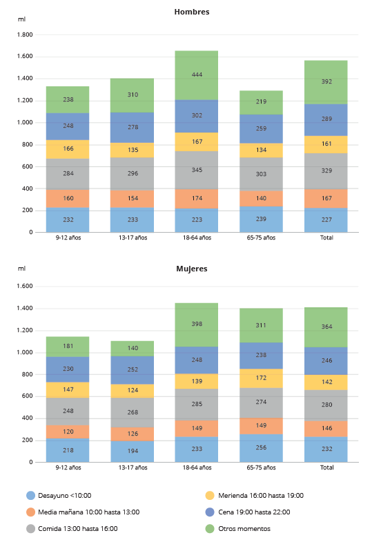 Tras la comida, “el desayuno y la cena son los momentos del día donde más líquido se ingiere”, comenta el Prof. Dr. Lluìs Serra-Majem. Por el contrario, “la media mañana (comprendida entre las 10:00 h y las 13:00 h) y la merienda (desde las 16:00 h a las 19:00h) son los momentos del día en los que menos líquido se consume en todos los grupos de edad”.