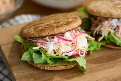 - ¡Llegó la hora de emplatar! Rellena tu pita con la lechuga, Krissia® Rallado, la cebolla encurtida y el queso feta.