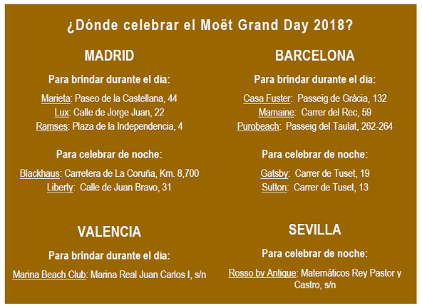 Tras la consecución el pasado 2017 del Récord Guinness de la pirámide de copas más alta del mundo, este año el champagne de las celebraciones organiza varias fiestas simultaneas en el territorio español, para que todo el que quiera pueda compartir un #moetmoment inolvidable.