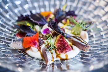 Sardina ahumada con ajo blanco de coco, uvas, higos y Pedro Ximénez
