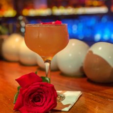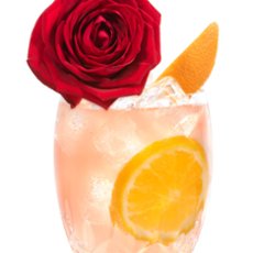 Agrega unos cubitos de hielo y mézclalo bien. Vierte los cubitos de hielo en tu vaso y añade el cóctel directamente en la coctelera. Adorna con una rosa para potenciar el aroma.
