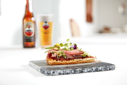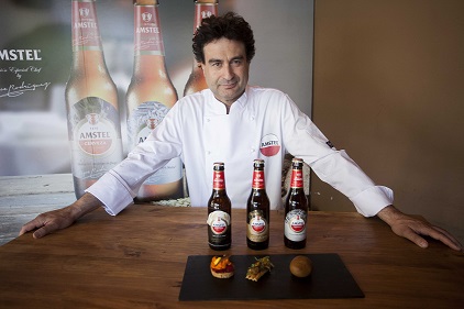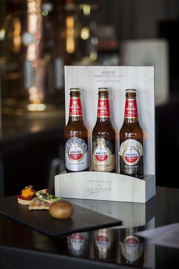 La ‘Edición Especial Chef by Pepe Rodríguez’ se presentó recientemente en Madrid, donde el popular chef rindió homenaje a las características que convierten a Amstel en una cerveza de alta calidad con la preparación de tres recetas: El sabor y cuerpo intenso de la malta 100% está representados en la Esfera de buñuelo con 100% carne de cocido; el Pimiento del piquillo empapado en pura malta con mango y anchoa se macera en Amstel adquiriendo todos los aromas de la cerveza por lo que no necesita mucha más elaboración para ser un pincho perfecto; Amstel 100% malta se termina con un golpe de fuego que aporta su sabor característico, representado en el Crujiente de presa ibérica con golpe de fuego.