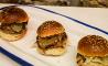 Trío de mini hamburguesas de ternera macerada con queso, cebolla carameliza y pepinillo