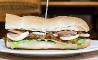 Sándwich de pan de masa madre de pollo al grill y pesto rosso con patatas fritas, gajo o ensalada de col: pollo, mayonesa ligeramente picante de pesto rosso y havarti
