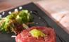 - Parrillada degustación de tres cortes: lomo, solomillo y ventresca y tres salsas: tártara, romescu y chutney de mango y ajo negro