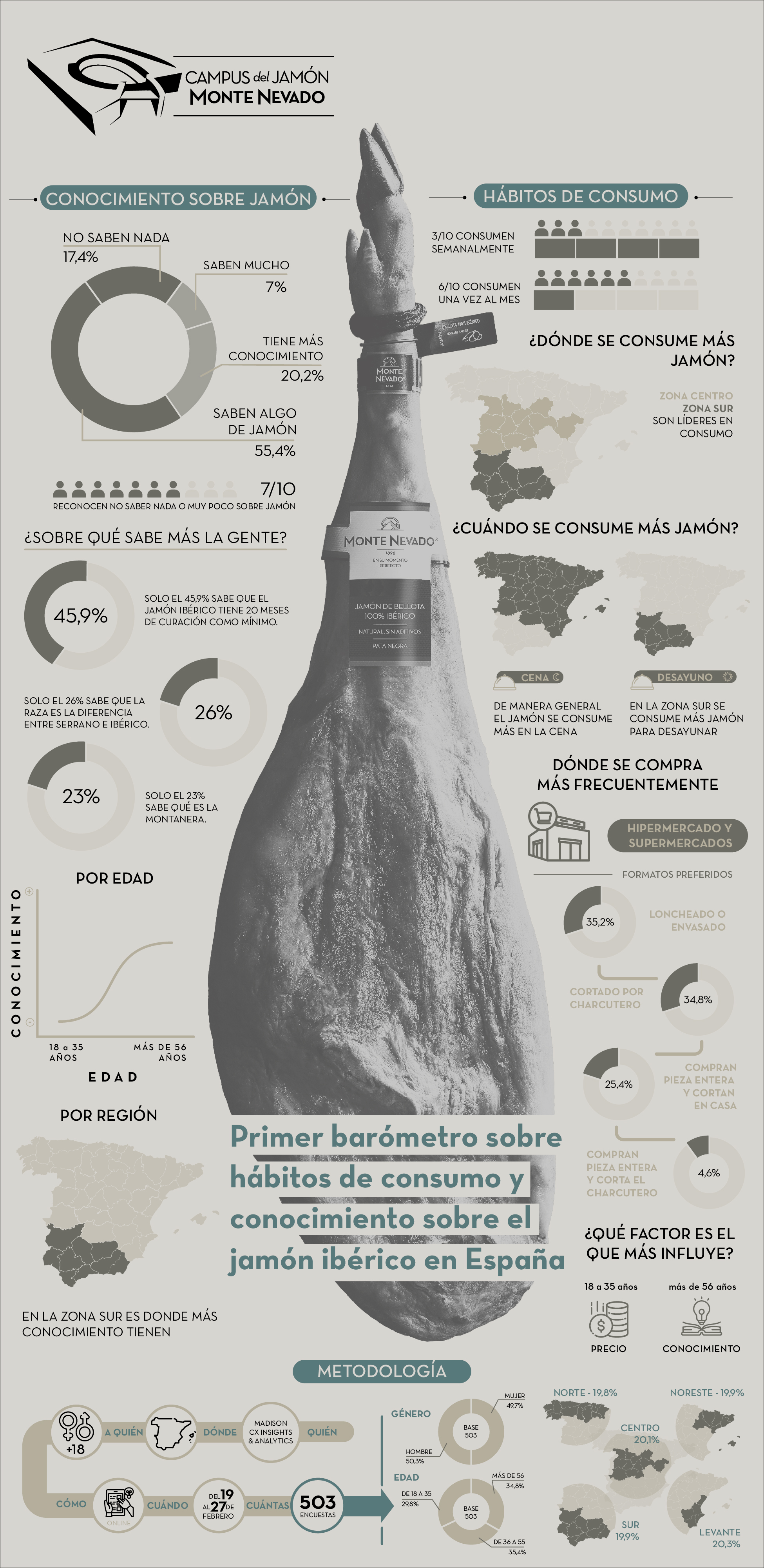 El primer Barómetro sobre consumo y conocimiento del jamón ibérico en España ha sido elaborado por Madison CX, Insights & Analytics para Monte Nevado, sobre una muestra de 503 hombres y mujeres mayores de 18 años de todo el territorio nacional durante el mes de febrero de 2024.