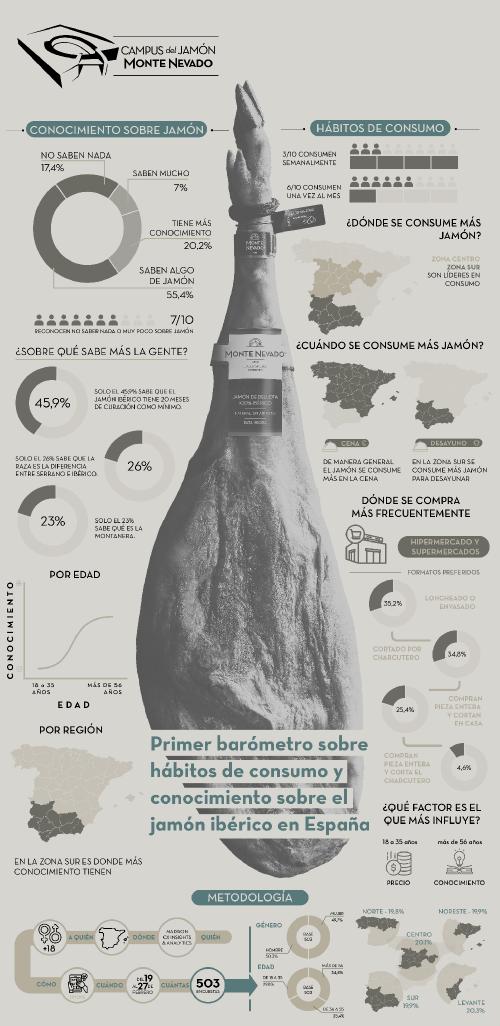 Campus del Jamón de Monte Nevado, el primer centro en el mundo dedicado íntegramente a la investigación, la formación y la difusión de la cultura del jamón curado, ha lanzado el primer Barómetro sobre consumo y conocimiento del Jamón Ibérico en España, con el objetivo de dar a conocer los hábitos de consumo y la familiarización de los españoles con una de las grandes joyas de la gastronomía de nuestro país: el jamón ibérico.