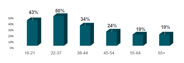 Este porcentaje aumenta al 50% en el caso de los jóvenes con edades comprendidas entre los 22 y 37 años, 19 puntos por encima de la media europea (31%) en este mismo segmento de edad. Seguidamente se sitúan aquellos que tienen entre 18 y 24 años (43%), mientras que, en el caso de los mayores de 55 años, 2 de cada 10 reconocen emplear también las nuevas tecnologías para controlar su consumo.