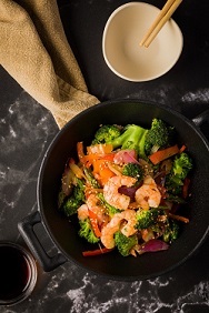 VERDURAS SALTEADAS CON COLA DE LANGOSTINO Y SÉSAMO