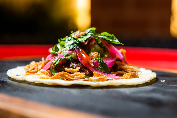 Taquitos de cochinita pibil, cebolla roja encurtida, lechuga en juliana, salsa agria