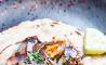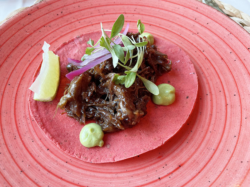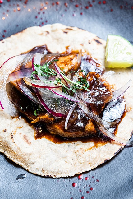 Taco de mollejas con demi-glace de puerro y chocolate amargo