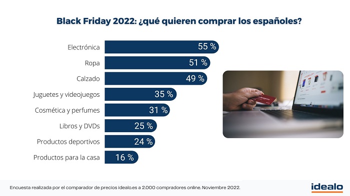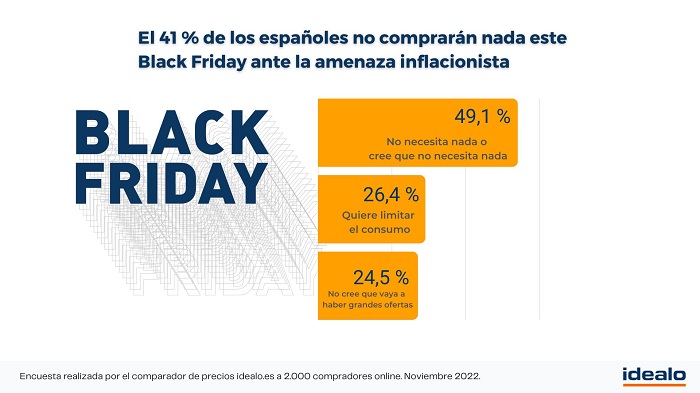 Uno de los principales motivos de los españoles para no incurrir en ninguna compra, a pesar de las ofertas que puedan existir, es que no necesitan nada nuevo: el 54 % afirma que ya tiene todo lo que precisa. Por su lado, 1 de cada 4 señala que quiere limitar su consumo, mientras que otro 27 % recalca que no cree que en este Black Friday vaya a haber grandes ofertas. En este sentido, otro sondeo desarrollado por idealo ha revelado que el 45 % de los españoles está renunciando a comprar/adquirir productos tecnológicos, los más demandados en estas fechas, debido a la alta inflación.