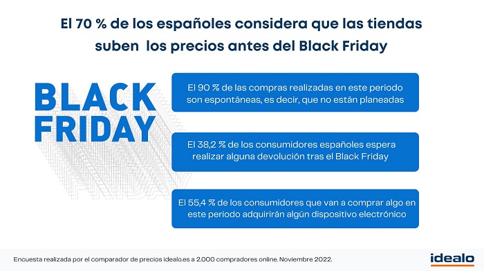 “El Black Friday de este año estará claramente marcado por la inflación y por las expectativas de ahorro que las familias tendrán en los próximos meses. Si la amenaza de la inminente recesión cala en los hogares, lo más probable que ocurra es que el consumo en estas fechas se resienta, así lo apunta esta encuesta” señala Kike Aganzo, responsable de comunicación de idealo.es, y añade que “Con todo, los comercios son conscientes de la importancia de estas fechas para su balanza comercial, por lo que todo apunta a que habrá grandes ofertas, a pesar de todo. Para realizar una compra inteligente, desde idealo recomendamos activar alertas de precios y controlar la fluctuación del precio con el paso de los días para adquirir el artículo en el momento idóneo”.