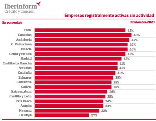 Los datos por comunidades autónomas muestran que Canarias es la Comunidad Autónoma que presenta una mayor tasa de inactividad (48%) entre sus empresas registralmente activas. Le siguen Andalucía (47%), Comunidad Valenciana (46%), Murcia (46%) y Ceuta y Melilla (45%). La Rioja (27%) es la comunidad española con un menor porcentaje de inactividad entre las empresas registralmente activas, seguida de Navarra (32%), Aragón (34%), País Vasco (34%) Castilla y León (35%), Extremadura (36%), Galicia (38%), Cantabria (38%), Baleares (39%), Cataluña (40%), Asturias (41%), Castilla-La Mancha (41%) y Madrid (43%).