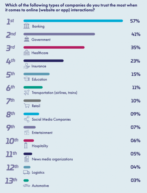 El informe también muestra cómo la brecha entre los sectores más ‘fiables’ que el resto se está agrandando. La banca destaca como el sector de más confianza con un 57%, seguido de servicios gubernamentales (40%, y salud (35%). En un segundo nivel tras estos sectores regulados se sitúan las aseguradoras (23%) y la educación (15%), con porcentajes de fiabilidad mucho más bajos en sectores orientados al cliente como venta minorista (10%), redes sociales (9%) y entretenimiento (7%). En general, los consumidores depositan la mayor confianza on line en los sectores responsables de gestionar datos personales confidenciales y servicios esenciales.