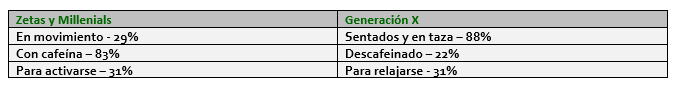 Además, Zetas y Millenials son los que más uso funcional hacen del café, ya que 1 de cada 3 lo eligen para activarse durante los exámenes o en el trabajo, frente a la Generación X, en la que destaca un amplio porcentaje del 31% que toman café para “relajarse y descansar”, y prefieren tomarlo en taza. Ligado a este dato, se observa además un progresivo incremento del consumo de café descafeinado con el aumento de la edad.