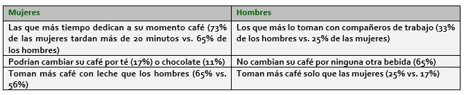 En cuanto a momentos de consumo, el 66% de las mujeres prefieren tomar el café solas como momento de relajación (frente al 59% de los hombres). Por otro lado, ellos toman más café con sus compañeros de trabajo (33% frente a 25%). Sin embargo, aunque las mujeres salen menos a tomar café, cuando lo hacen dedican más tiempo, ya que un 73% de mujeres afirma dedicarle más de 20 minutos (frente al 65% de hombres). Además, ellos son más fieles al café: El 65% de los hombres no cambiaría su café por ninguna otra bebida. En cambio, el 17% de las mujeres lo haría por té verde y el 11% por chocolate.