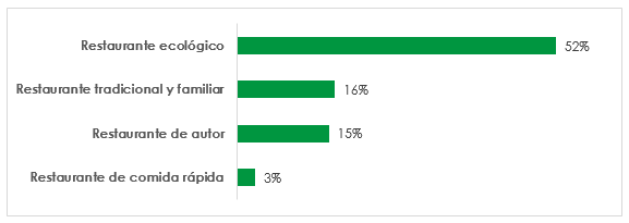 Consultados por el tipo de restaurante que consideran más sostenibles, el 52% de los usuarios cree que los restaurantes comida orgánica/ecológica son los más sostenibles, seguidos de los restaurantes tradicionales/familiares (asadores, casas de comida, etc.), los de autor y, por último, los de comida rápida.