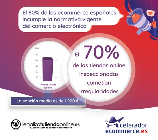 El 80% de los ecommerce españoles pueden estar incumpliendo la legislación en materia de consumo para el comercio electrónico en este 2022, según estimaciones, como resultado de la colaboración entre AceleradorEcommerce.es y Legalizatutiendaonline.es Casi el 70% del comercio electrónico sometido a inspecciones en años anteriores cometían alguna irregularidad, cifra que podría incrementarse debido a la entrada en vigor de las últimas normativas, las activadas en julio de 2021 y en enero de 2022. La sanción media para los ecommerce con deficiencias legales es de 1.900 euros. Se estima que más de 20.000 tiendas online podrían ser inspeccionadas en España a lo largo de este año.