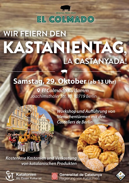 El próximo sábado 29 de octubre, Berlin celebrará una fiesta de la castañada muy especial. PRODECA - Departament d’Acció Climàtica, Alimentació i Agenda Rural i la Delegació del Govern de la Generalitat en Alemania, en colaboración con el establecimiento de alimentación gourmet y bar de tapas El Colmado, organiza una jornada para descubrir y disfrutar de la gastronomía y la cultura catalana. En un ejemplo de cómo la gastronomía y la alimentación se integra en la cultura catalana, el evento contará con la degustación de productos y platos típicos catalanes (panellets, castañas y otros dulces) y la actuación de los Castellers de Berlin.