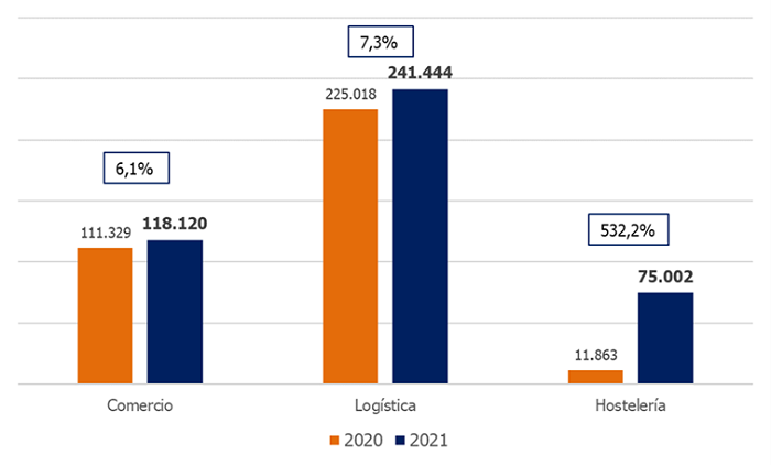 Todos los sectores que forman parte de este estudio verán incrementar su volumen de contratación con respecto al año pasado. El comercio crecerá en un 6,1%, mientras que la logística lo hará en un 7,3%. Pero el incremento realmente significativo se producirá en el sector de la hostelería, ya que las contrataciones pasarán de las 11.863 del año pasado a las 75.002 actuales, un volumen que se multiplicará por un 6,3. Un sector con un amplio margen de mejora ya que, a pesar del relevante incremento que obtendrá este año, en 2019 se firmaron 161.104 contratos, más del doble.