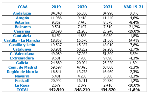 Ya registrando caídas con respecto al año 2019, pero aún por encima de la media nacional (-1,8%), se encuentran Euskadi (-1,2%), la Comunidad de Madrid (-1,3%) y Cantabria (-1,8%).