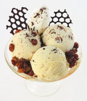 Llenar el fondo de una copa de cristal con crema chantillí. Cubrir la crema con un puñado de pasas y colocar encima de éstas tres bolas de helado Carte D`Or Vainilla y un poco de helado Carte D`Or Leche Merengada.
