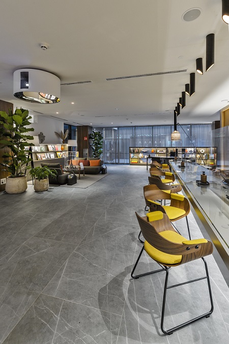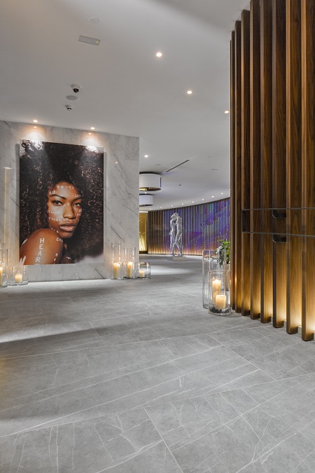 Para los pavimentos del lobby principal y zonas comunes de la planta baja, se eligió la superficie Zaha Stone de Neolith, que ofrece una reinterpretación contemporánea de la Piedra Gris iraní a la que se le añade un tono más industrial y moderno.